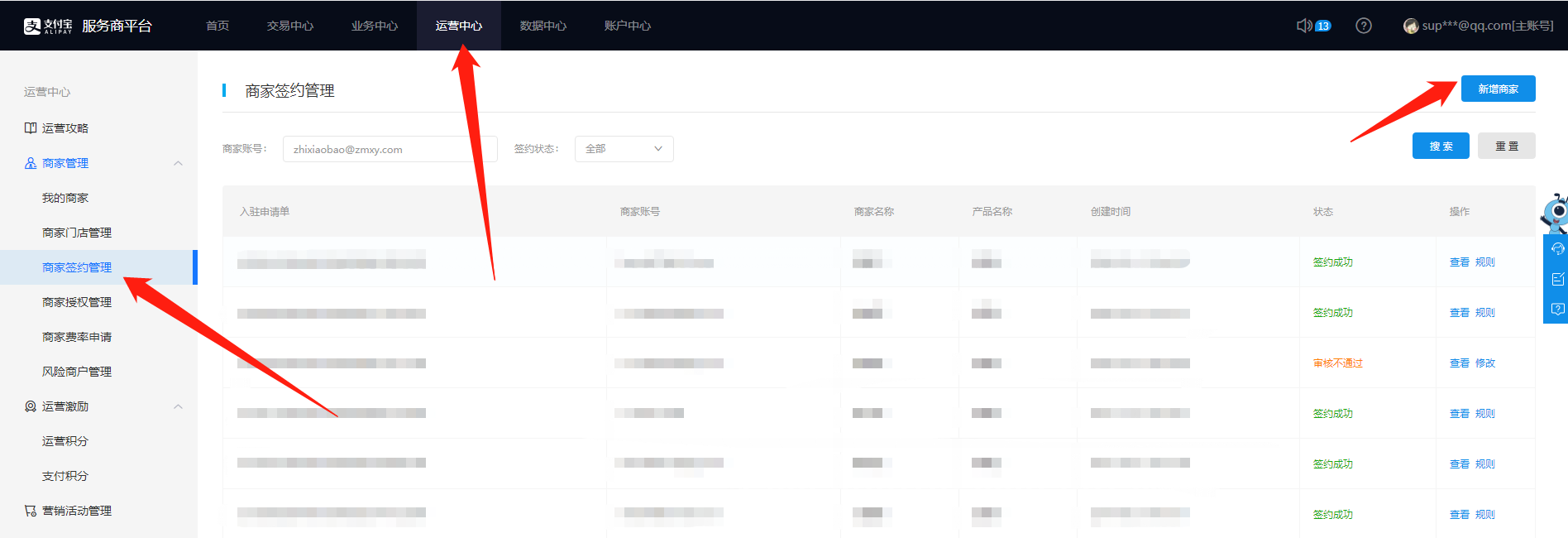 2.进入支付宝开放平台(https://isv.alipay.com/isv/settling/queryMerchantSignProductList.htm#/ ),点击新增商家