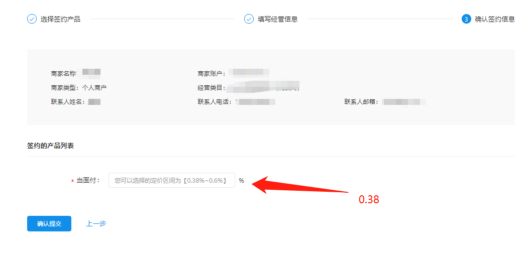 6.联系人信息务必填写正确,审核通过后会通过电子邮件和手机短信来通知的,费率输入0.38%即可。