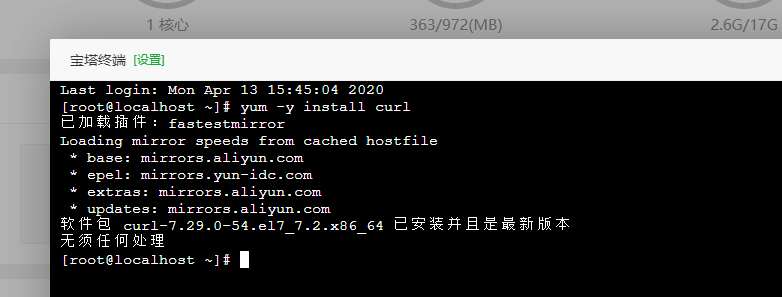 通过后台宝塔终端或者ssh连接linux输入: yum -y install curl 声明:本站所有文章,如无特殊说明或标注,均为本站原创发布。任何个人或组织,在未征得本站同意时,禁止复制、盗用、采集、发布本站内容到任何网站、书籍等各类媒体平台。如若本站内容侵犯了原著者的合法权益,可联系我们进行处理。