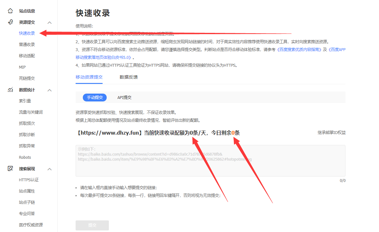 相信很多站长朋友都知道之前的百度熊掌id有个天级推送收录,那个对于当天更新的文章收录速度是非常快的,基本上内容比较新,原创的内容都会次日收录,前不久百度关闭了熊掌id的相关功能,但是该功能还是被保留了,迁移到了站长平台内,增加了快速收录的项目,但进入后发现该项目推送配额为0
