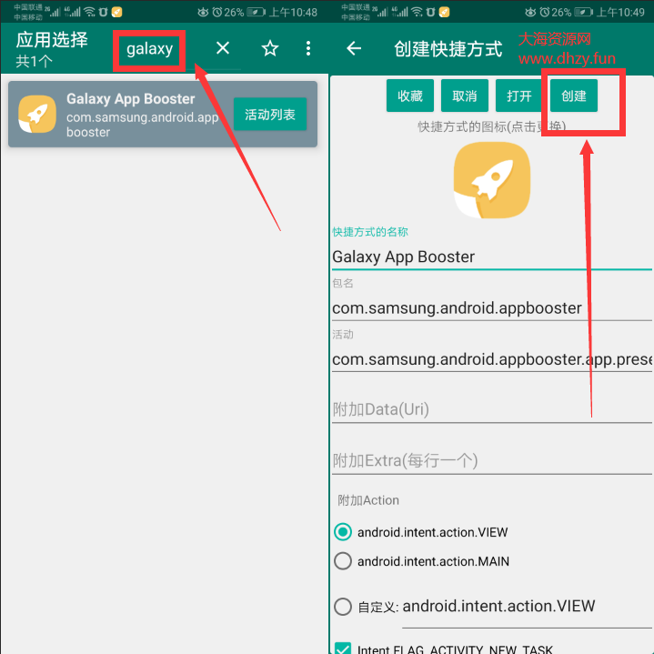 下载安装包后,安装优化神器,默认安装成功后可以直接打开但桌面上没有APP图标。为了方便以后使用,还可以安装一个“创建快捷方式”APP,为Galaxy App Booster创建一个桌面图标。