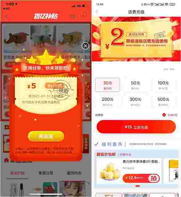 第3次必中满10减5元话费券 领取后需要到京东极速版APP充值使用!有需要的都去领取一下!