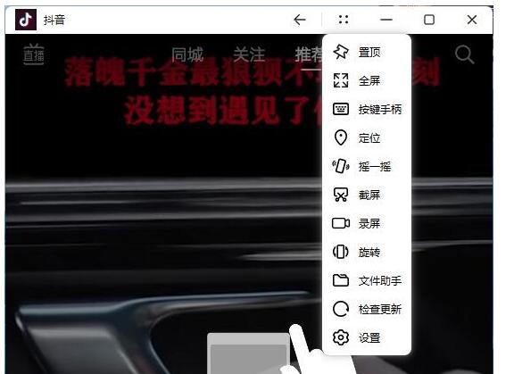 在窗口的菜单里面还提供了置顶、全屏、按键手柄、定位、摇一摇、截图、录像、旋转、文件助手等功能。