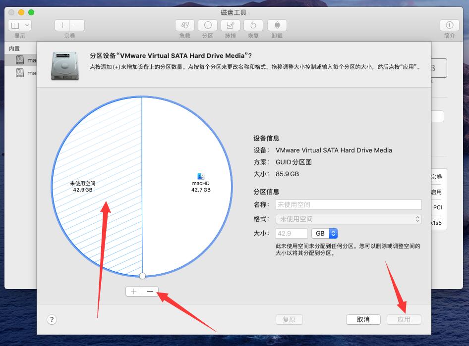 5、点击圆饼图中未使用的空间→点下边的减号→应用→分区→等几分钟→完成