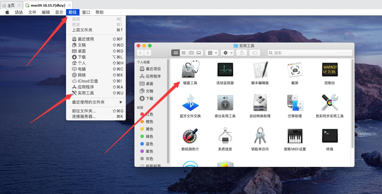 3、开启虚拟机→前往→实用工具→磁盘工具