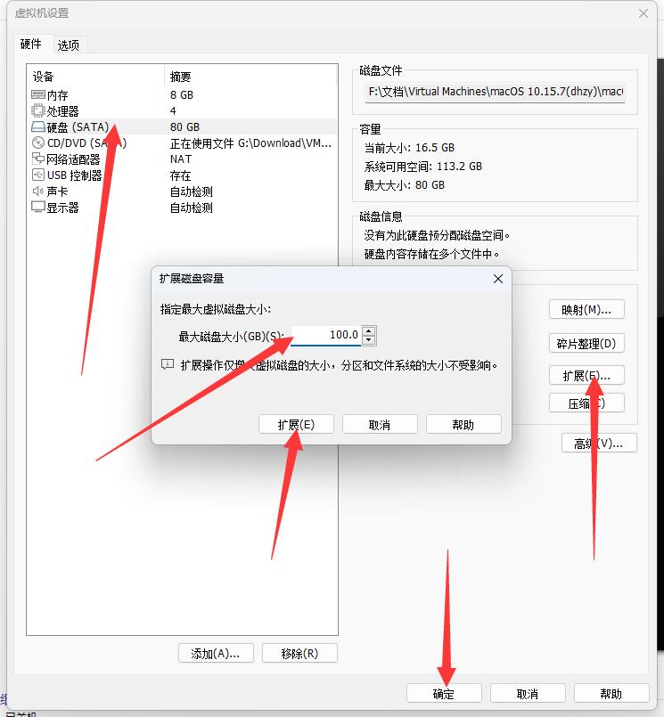 2、选择硬盘→扩展→修改扩展后的硬盘大小(GB)→扩展→确定