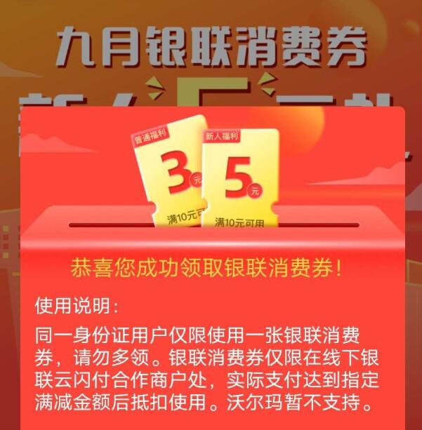 (截止22/9/14)【沃钱包领取10-5元银联消费券】沃钱包APP->首页下拉点击横幅进入->直接领取,每天限量5万份->根据要求被商家扫即可抵扣;