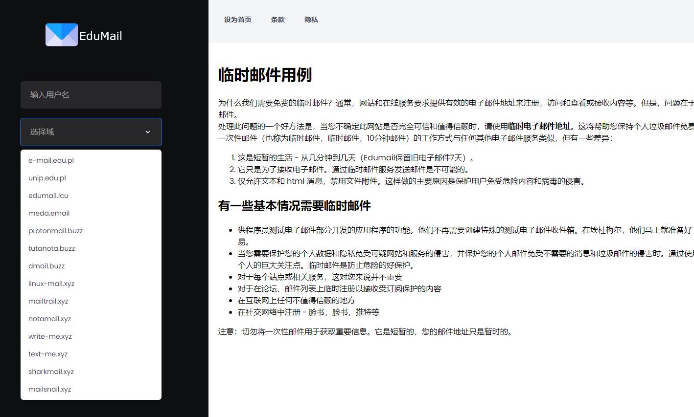 日常网上冲浪,有些内容必须要注册才可以看到,而使用自己的真实邮箱往往会收到很多垃圾邮件,临时邮箱就可以很好的解决这一问题,填入一个不重复的用户名,选择一个后缀,马上就可以接收邮件。
