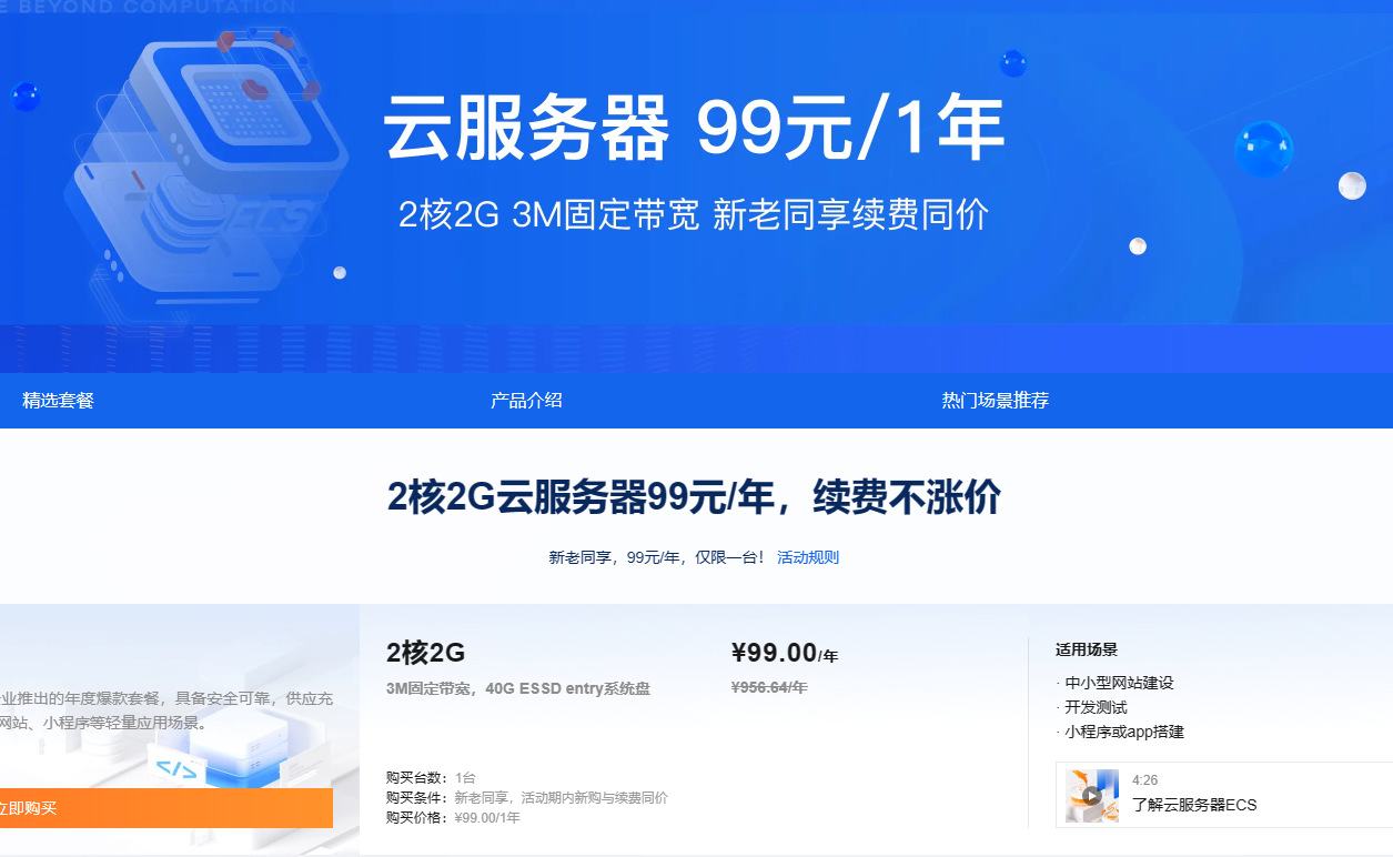 总是说阿里云没有活动,这会活动可是真来了,错过了可别怪我,2核2G的配置一年99元,等于白送,也就是个电费,做个个人博客啥的绰绰有余。