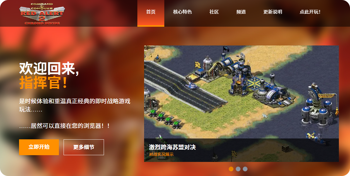 其实国外最开始的网页版红警是Chronodivide,但这个网站在中国区的加载速度实在是堪忧,才有了现在的红色井界™,红色井界™当前是 Chronodivide 的镜像运营站点。