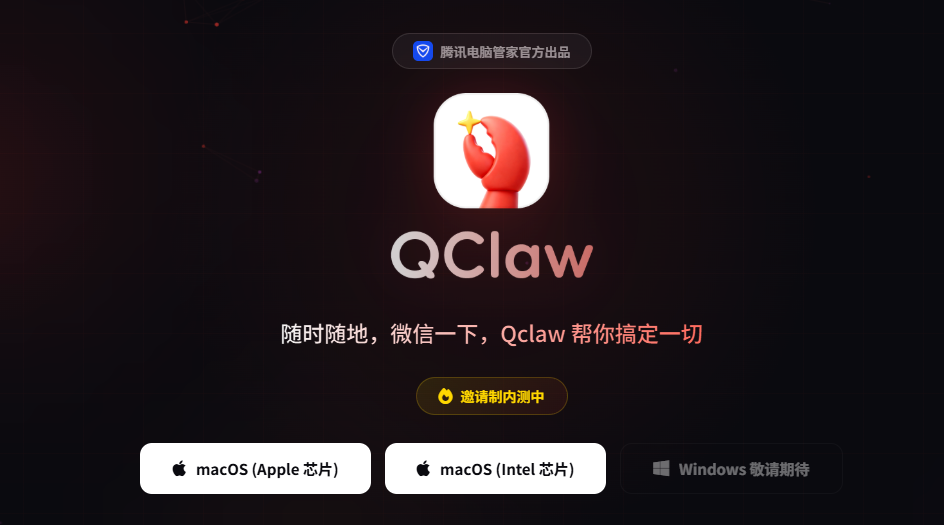 虽然 QClaw 极度诱人,但目前还在内测阶段,且官方首发仅提供了 macOS 版本的安装包。